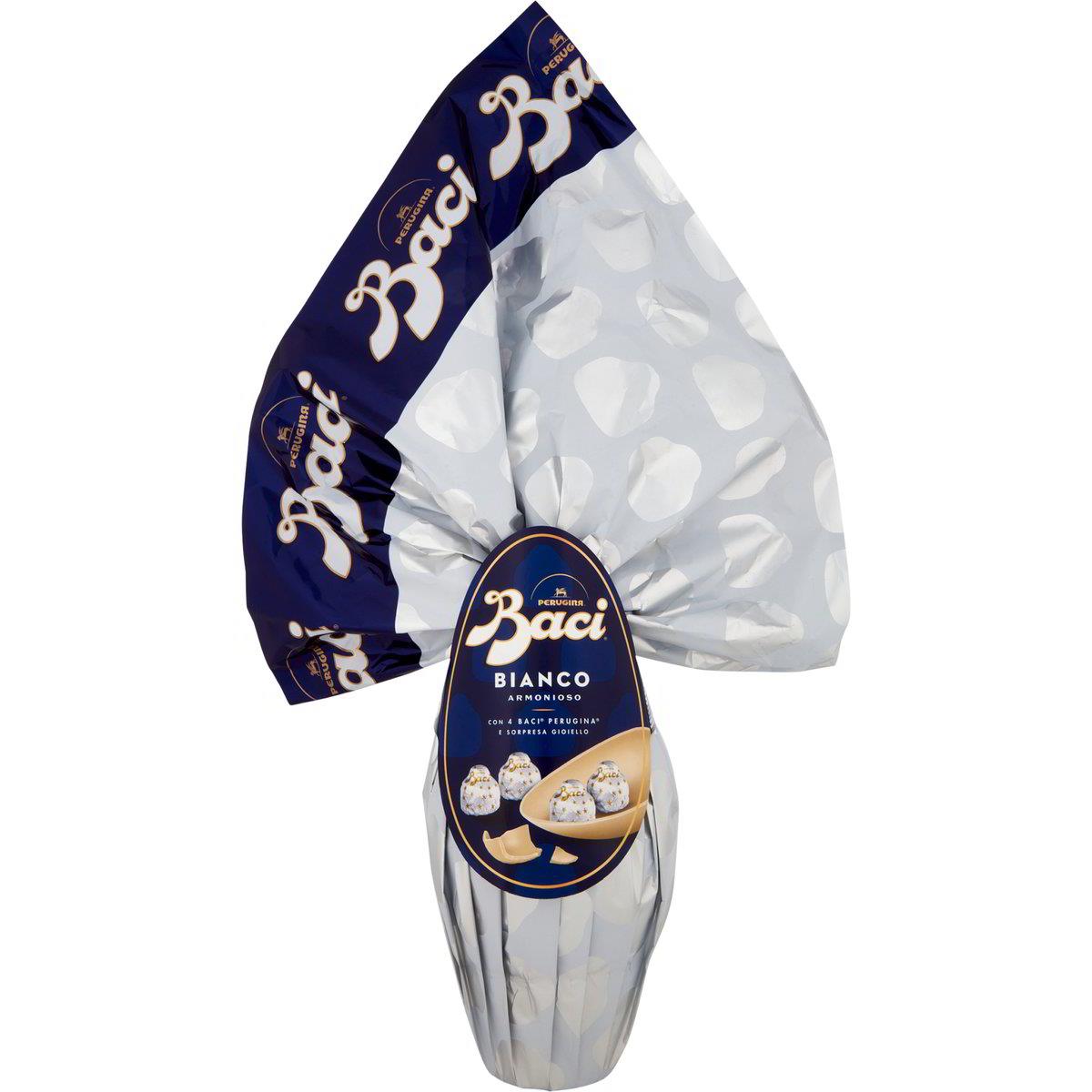 Wählen Sie zu Ostern das Baci Bianco Osterei und genießen Sie eine Emotion mit dem köstlichen Ei mit weißer Schokolade. Die Hülle aus weißer Schokolade enthält eine doppelte Überraschung: ein raffiniertes Geschenk 100% Made in Italy und 4 Baci Perugina Bianco Armonioso, die Sie mit Ihren Liebsten teilen können.